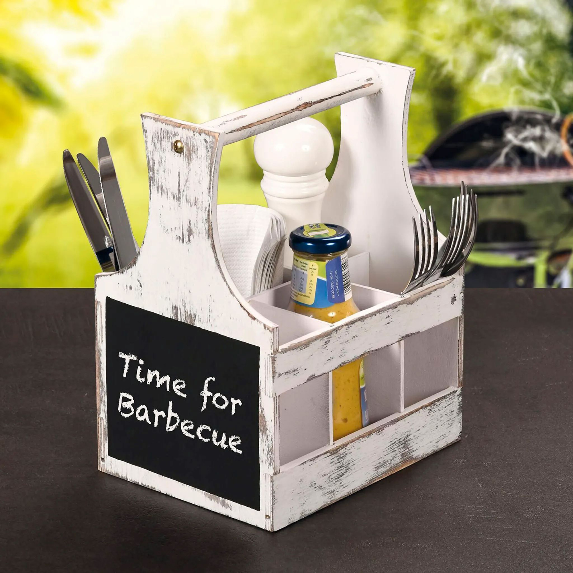 Dieser elegante und funktionale Halter mit 6 Fächern ist ideal, um Besteck, Soßen, Servietten und Gewürze zu organisieren. Ein ausgezeichneter Helfer für Grillfeste und Partys, kann er mit dem praktischen Griff leicht zum Tisch getragen werden.