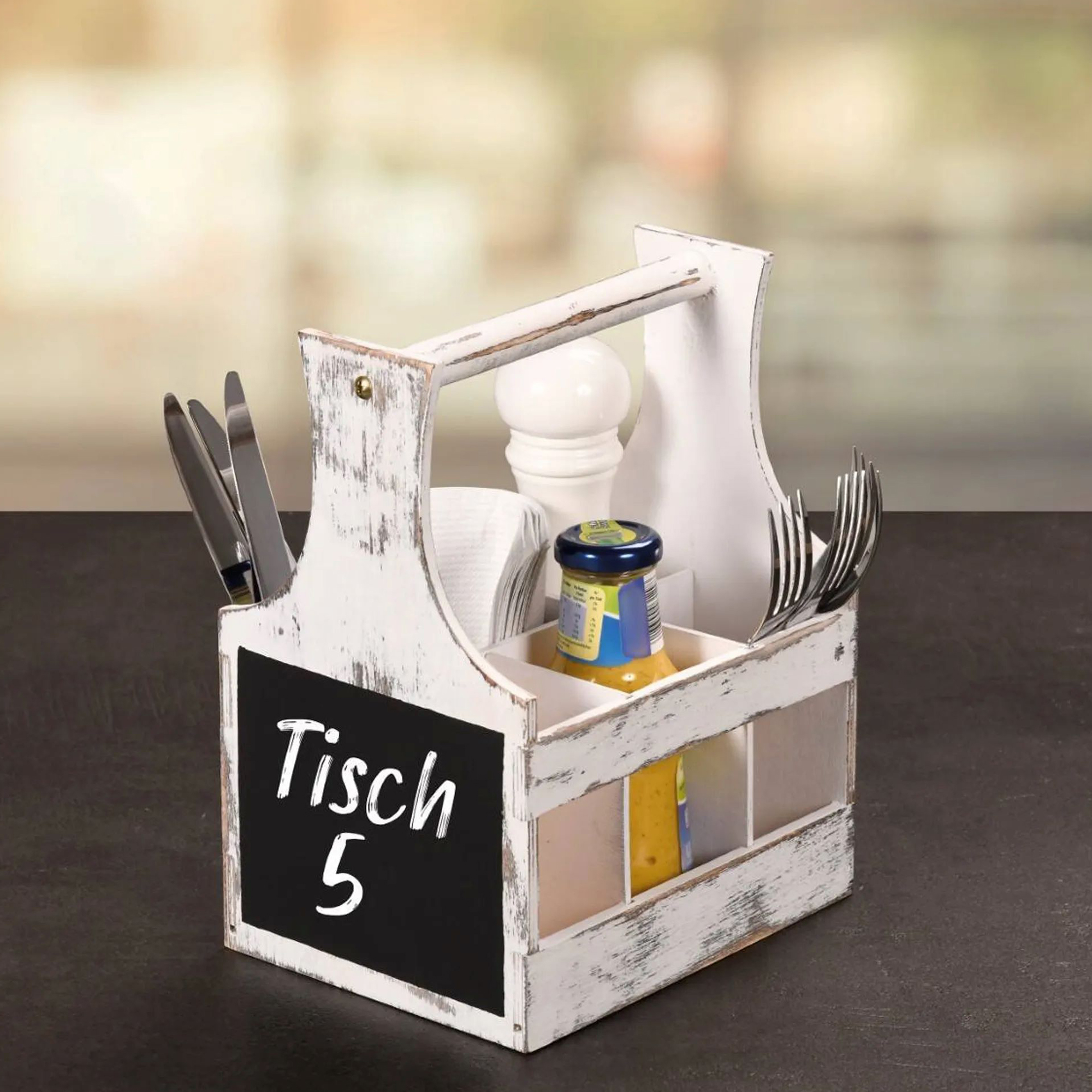 Besteck- und Gewürzhalter, hergestellt von Kesper, gefertigt aus weißem Holz, mit einem praktischen Griff und einer Tafel an der Seite, Größe 20 x 16 x 26 cm.