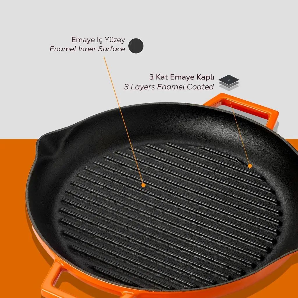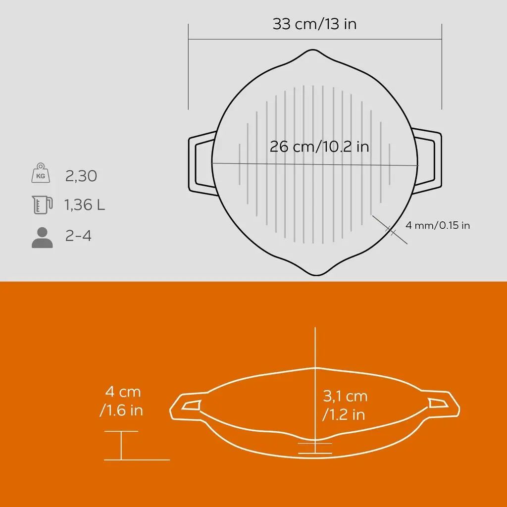 Grillpfanne,Marke Lava, Innendurchmesser von 26 cm,Fassungsvermögen von 1,36 l,aus Gusseisen.