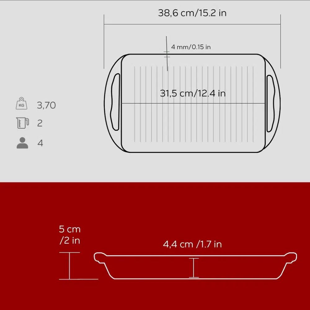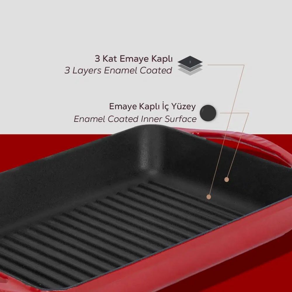 Die Wände der Grillpfanne sind 4 mm dick und innen ist das Produkt mit einer Schicht schwarzer Emaille beschichtet, die die Bildung einer Antihaftbeschichtung beim Kochen mit Fett begünstigt.