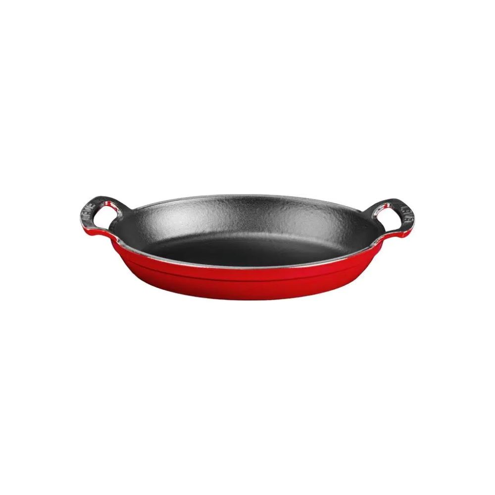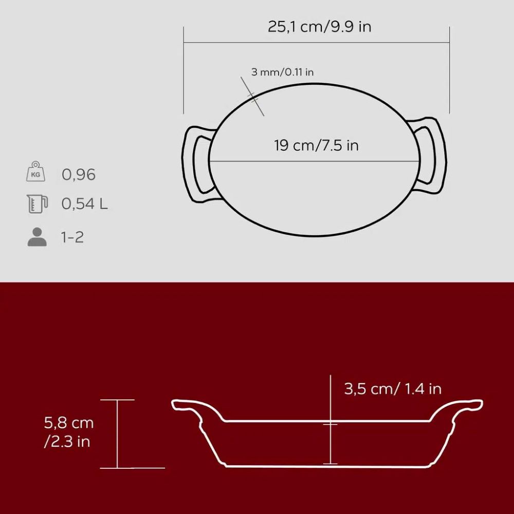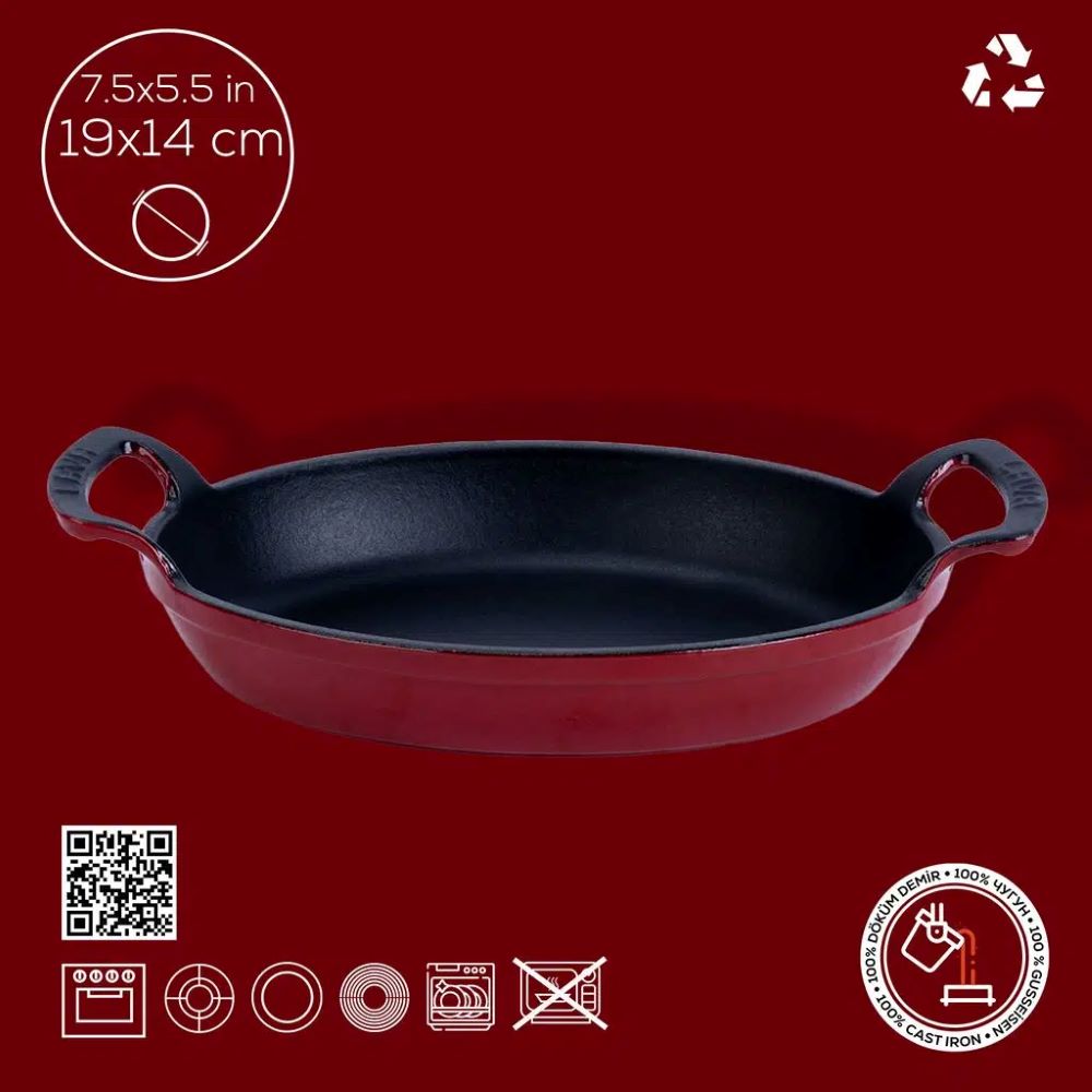 Die Stärke des Bodens beträgt 3,5 mm und macht es möglich, dass Lava Kochgeschirr auf allen Herdarten, einschließlich Induktionskochfeldern, verwendet werden kann. Verwenden Sie die Gusseisenschale nicht in der Mikrowelle.