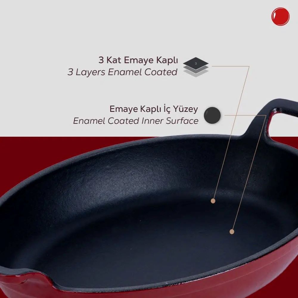 Die Pfannenwandstärke beträgt 3 mm und auf der Innenseite ist das Produkt mit einer Schicht schwarzer Emaille beschichtet, die die Bildung einer Antihaft-Oberfläche beim Braten mit Fett erleichtert.