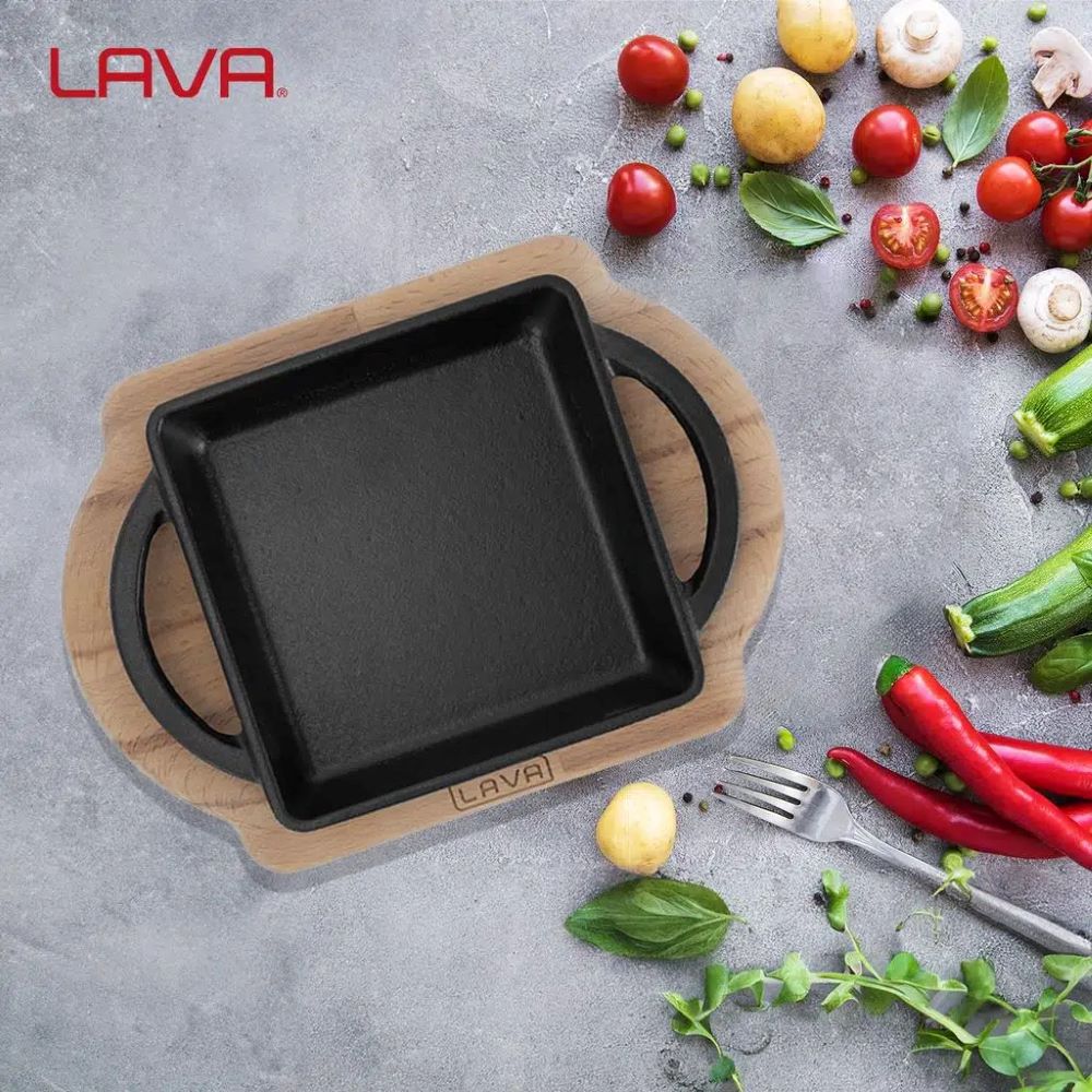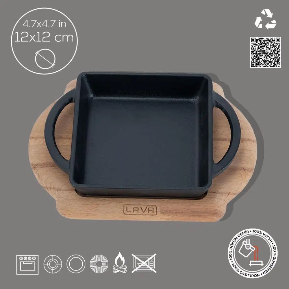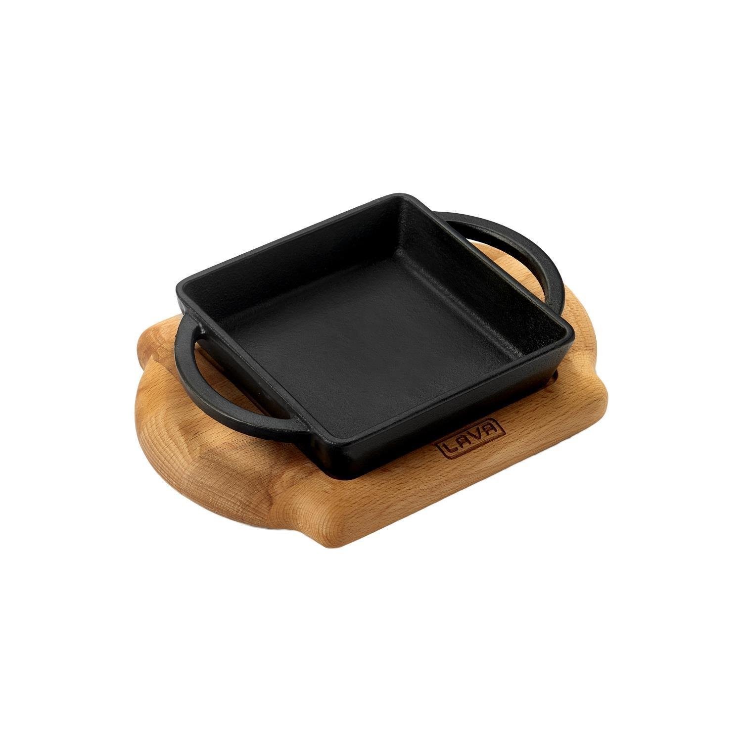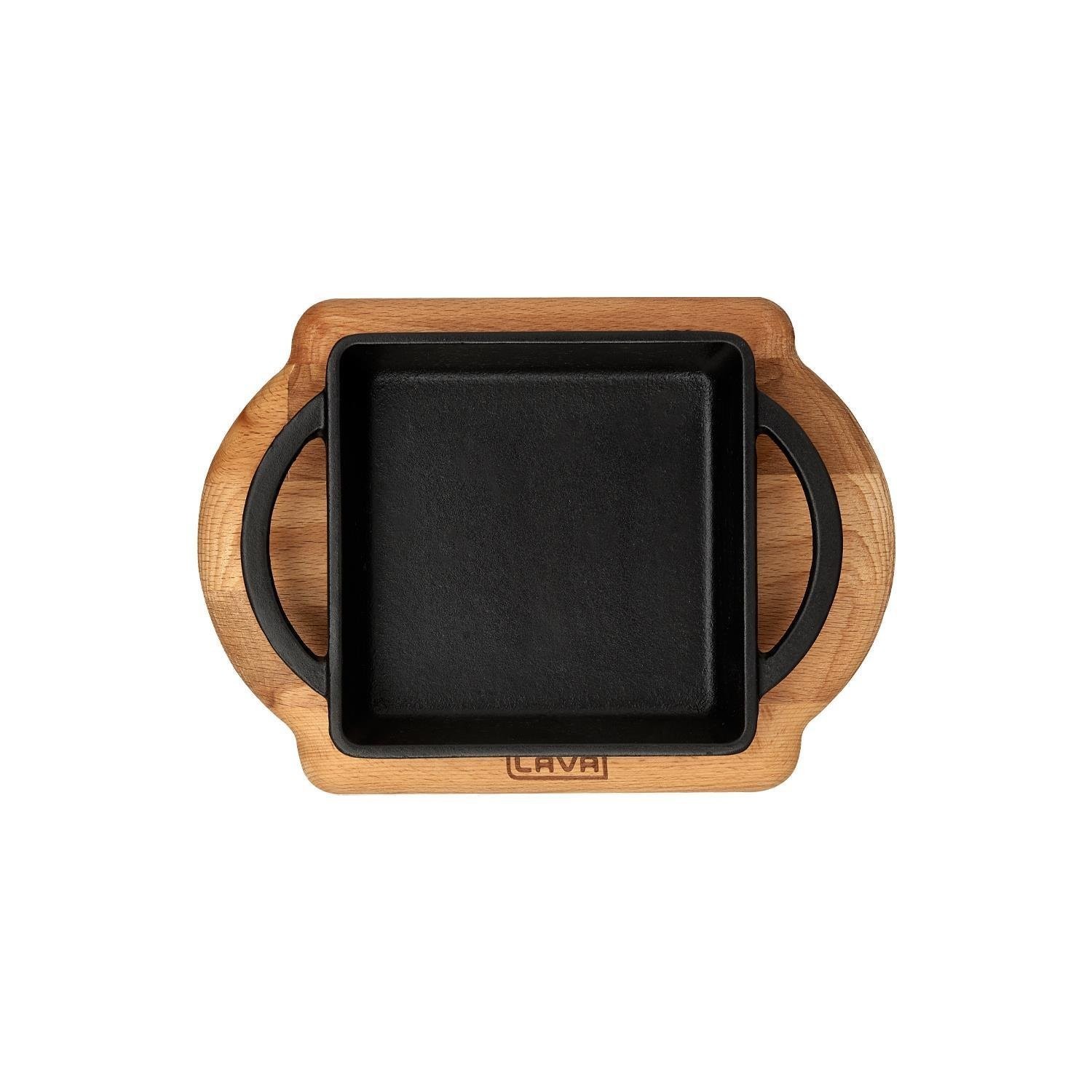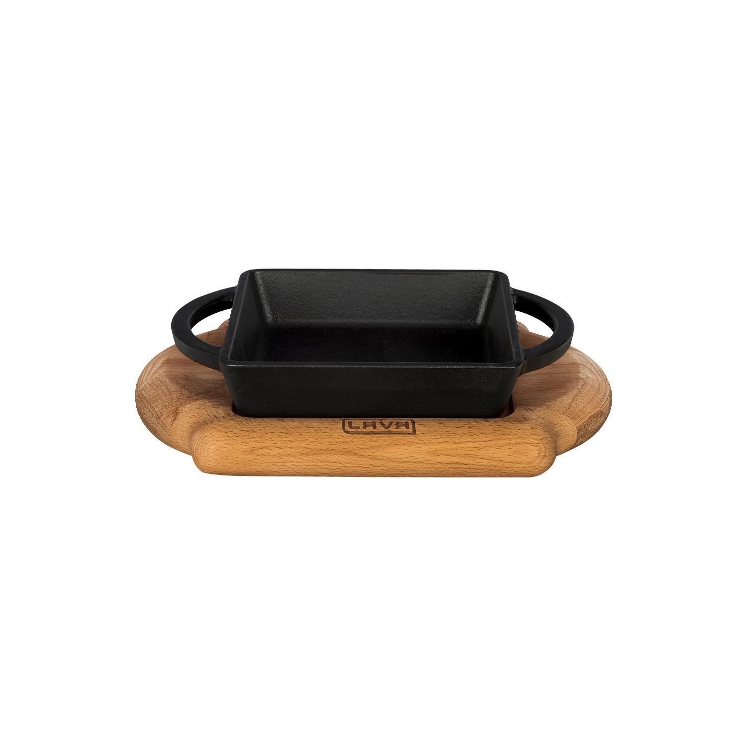 Servierschale aus Gusseisen mit Holzständer, Marke Lava , hergestellt aus Gusseisen.