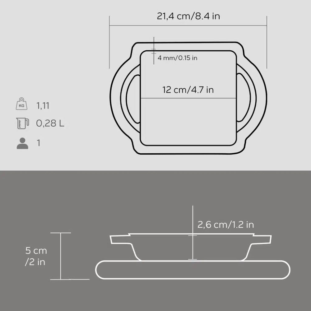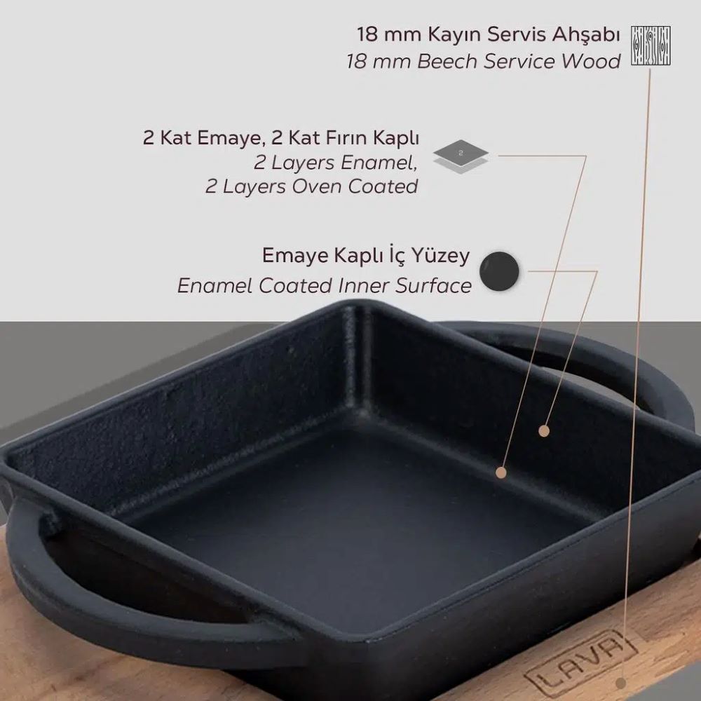 Die Wände der Servierschale sind 4 mm dick. Innen ist das Produkt mit einer Schicht schwarzer Emaille beschichtet, die beim Kochen mit Fett die Bildung einer Antihaftbeschichtung begünstigt.