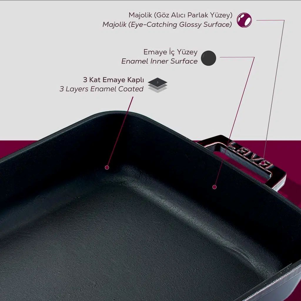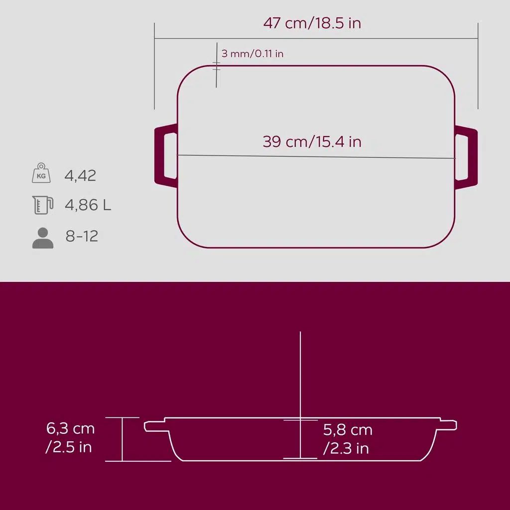 Mit einem Fassungsvermögen von 4,86 l verfügt das Backblech über 3 dicke Emailleschichten an der Außenseite und eine mattschwarze Oberfläche an der Innenseite. Die Stärke des Bodens beträgt 5 mm und die der Seitenwände 3 mm.