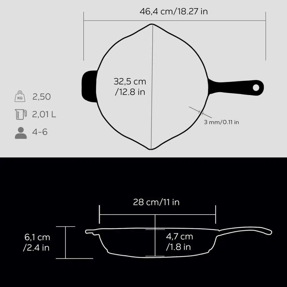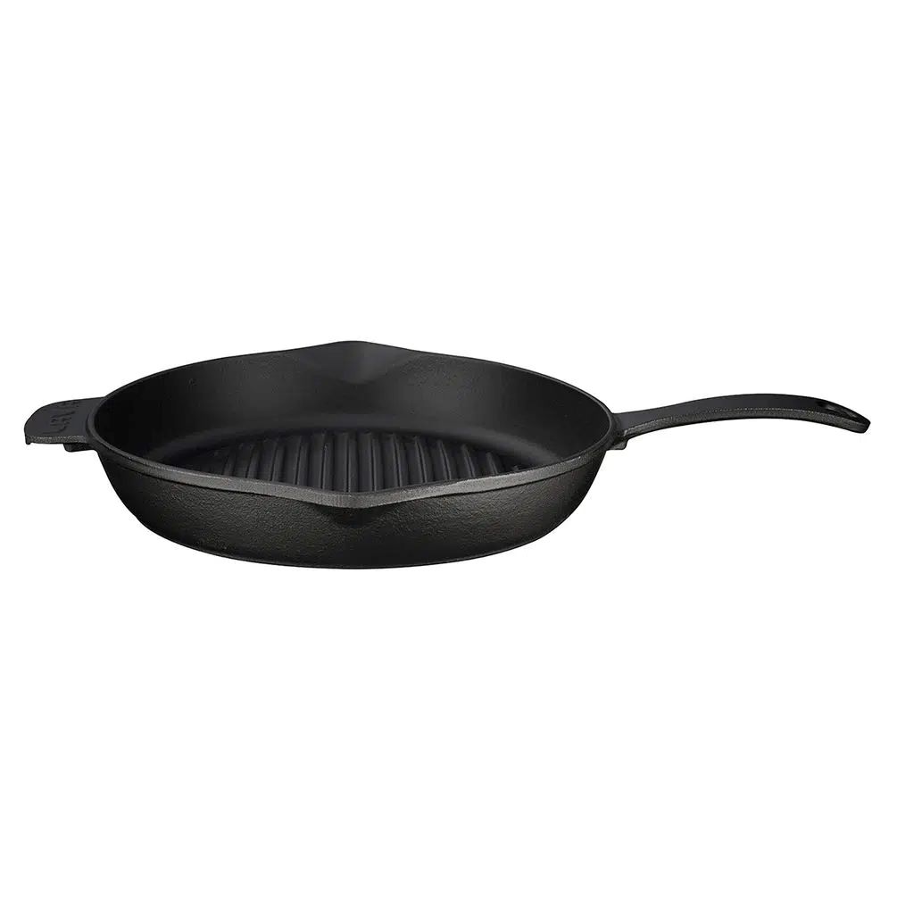 Die Pfannenwände sind 3 mm dick und auf der Innenseite ist die Grillpfanne mit einer Schicht schwarzer Emaille beschichtet, die die Bildung einer Antihaftoberfläche beim Kochen mit Fetten erleichtert.