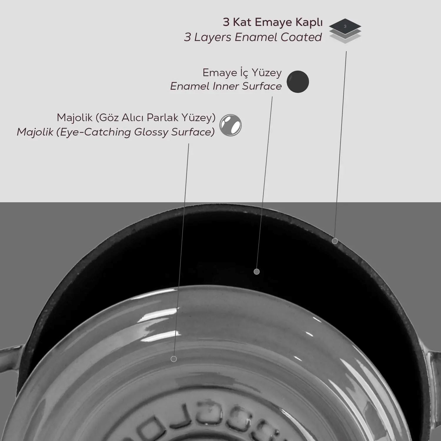Das Premium-Sortiment verwendet die spezielle Farbauftragstechnik „Majolika“ , die dem Kochgeschirr einen einzigartig glänzenden Emaille und sehr intensive Farbtöne verleiht. Die Farbtechnik „Majolika“ besteht aus dem Auftragen von drei Spritzschichten – die erste Schicht wird aufgetragen, um eine glattere und gleichmäßigere Oberfläche zu erhalten, die zweite Schicht erzeugt den Glanzeffekt und die dritte Schicht erzeugt das Gefühl von Tiefe und verstärkt den glänzenden Look.