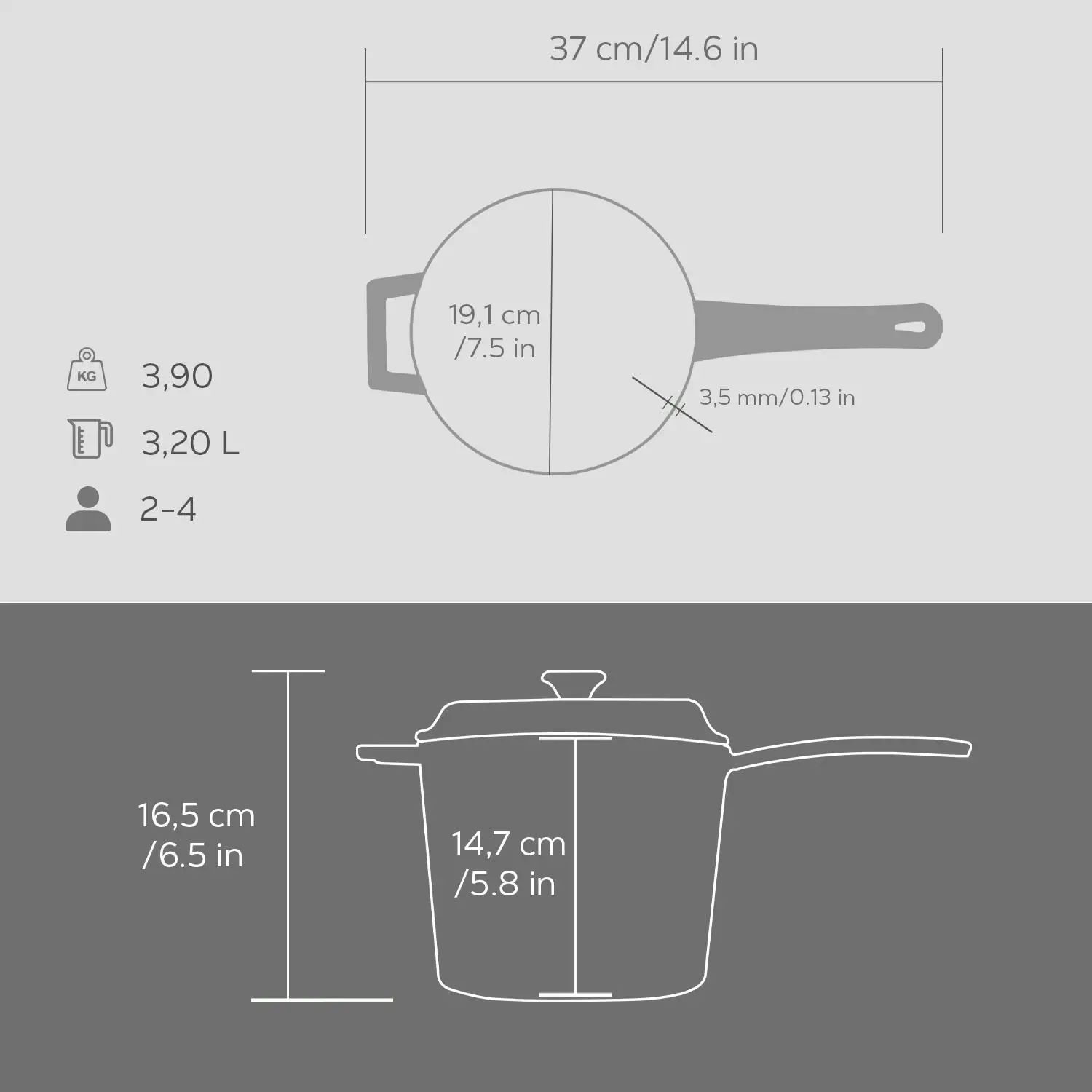 Der Kochtopf ist innen schwarz emailliert, mit einer Bodenstärke von 4,5 mm und einer Wandstärke von 3,5 mm.