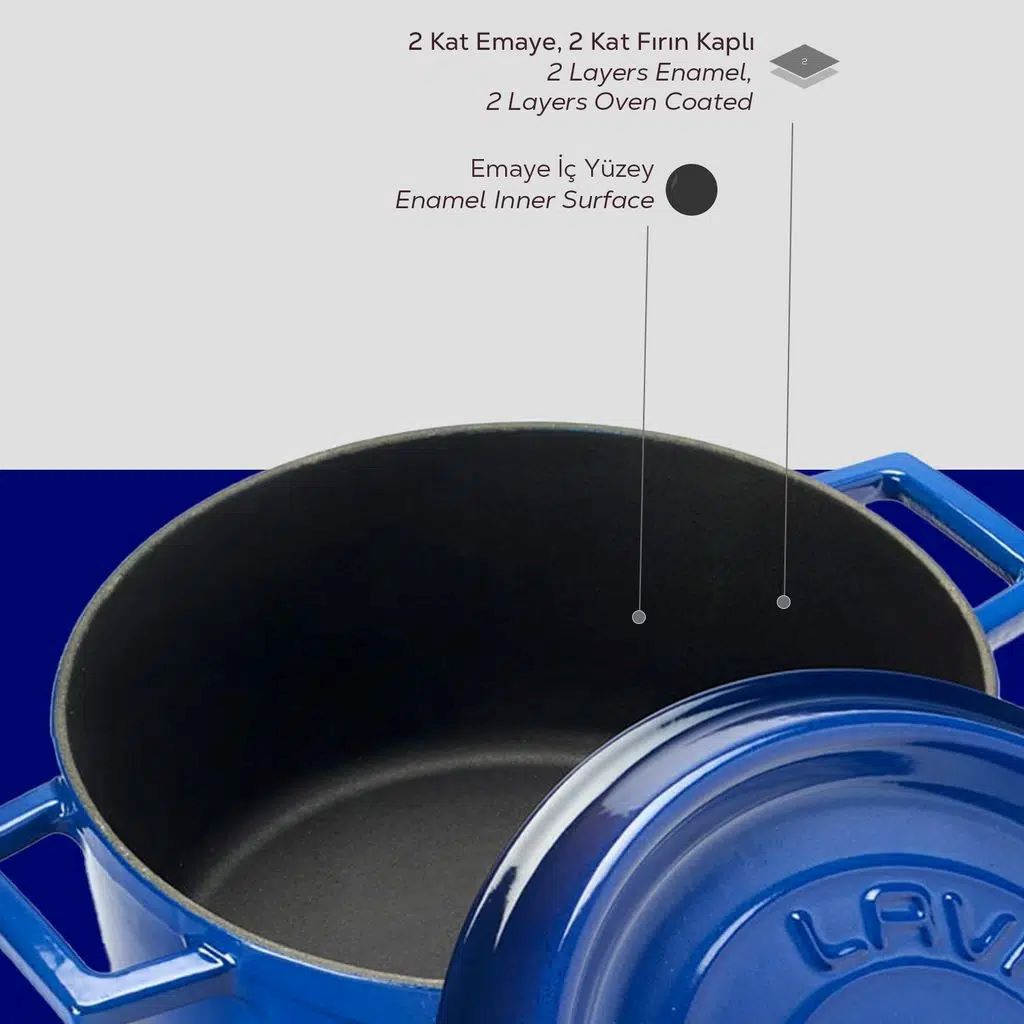 Die glasartige Emaille, das Material, das für die äußere Veredelung des LAVA gusseisernen Kochgeschirrs verwendet wird, wird durch das Aufsprühen von Glaspulver bei Temperaturen von 750 - 850 °C gewonnen. Das Glaspulver haftet an der Oberfläche des Topfes und bildet eine Schutzschicht, die auch dazu beiträgt, die Wärme optimal zu verteilen.
