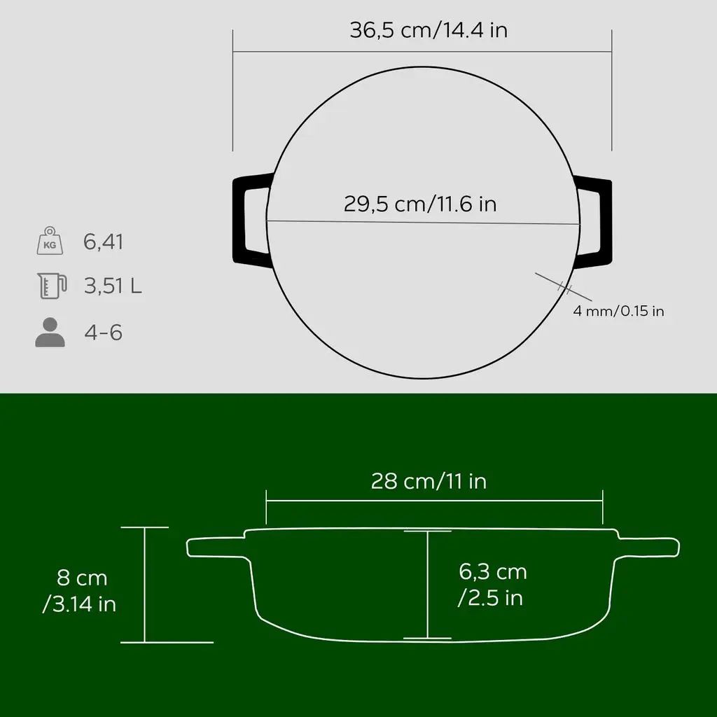 Die Stärke des Bodens beträgt 5 mm, wodurch Lava -Kochgeschirr auf allen Herdarten, einschließlich Induktionskochfeldern, verwendet werden kann.