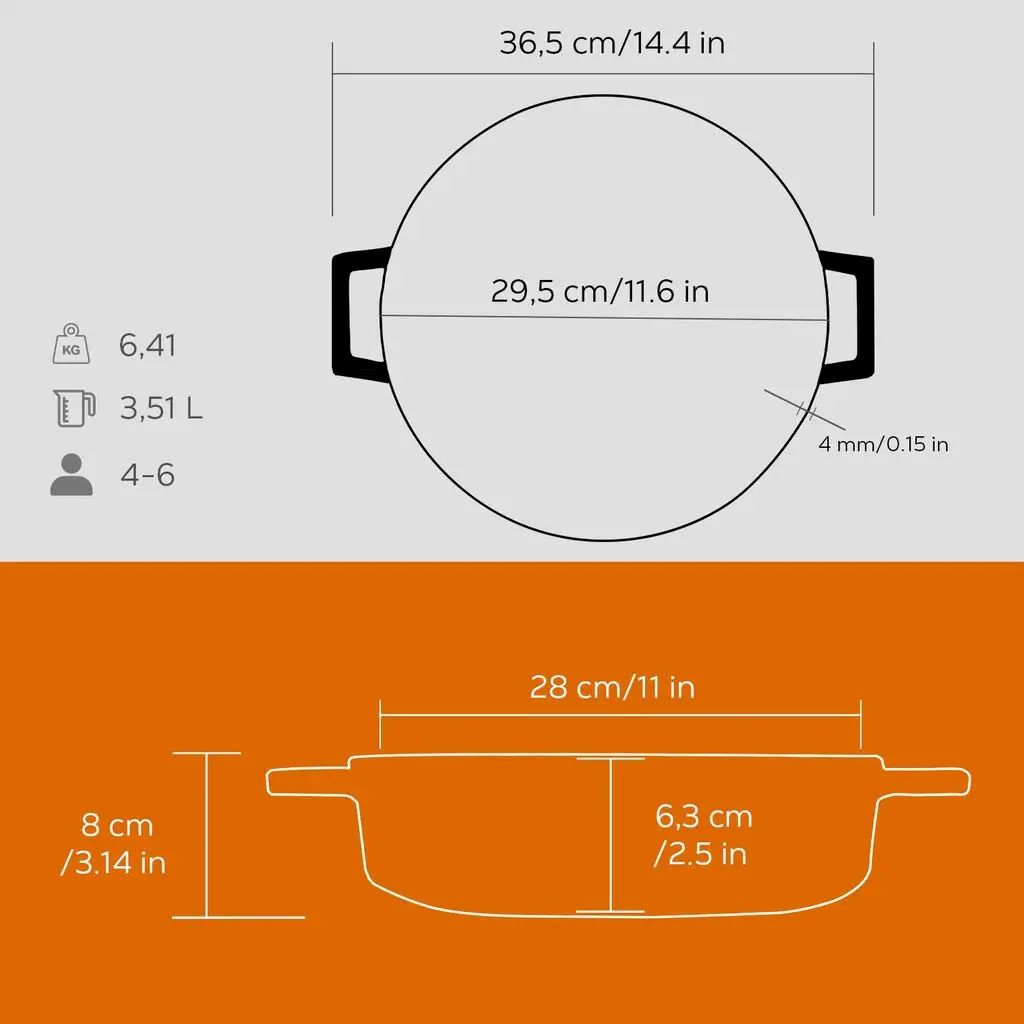 Die Stärke des Bodens beträgt 5 mm, wodurch Lava -Kochgeschirr auf allen Herdarten, einschließlich Induktionskochfeldern, verwendet werden kann.