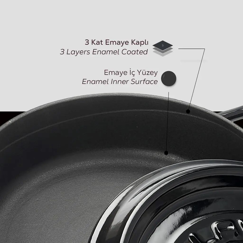 Die Topfwandstärke beträgt 4 mm. Auf der Innenseite ist das Produkt mit einer Schicht schwarzer Emaille beschichtet, die die Bildung einer Antihaft-Oberfläche beim Kochen mit Fett erleichtert.