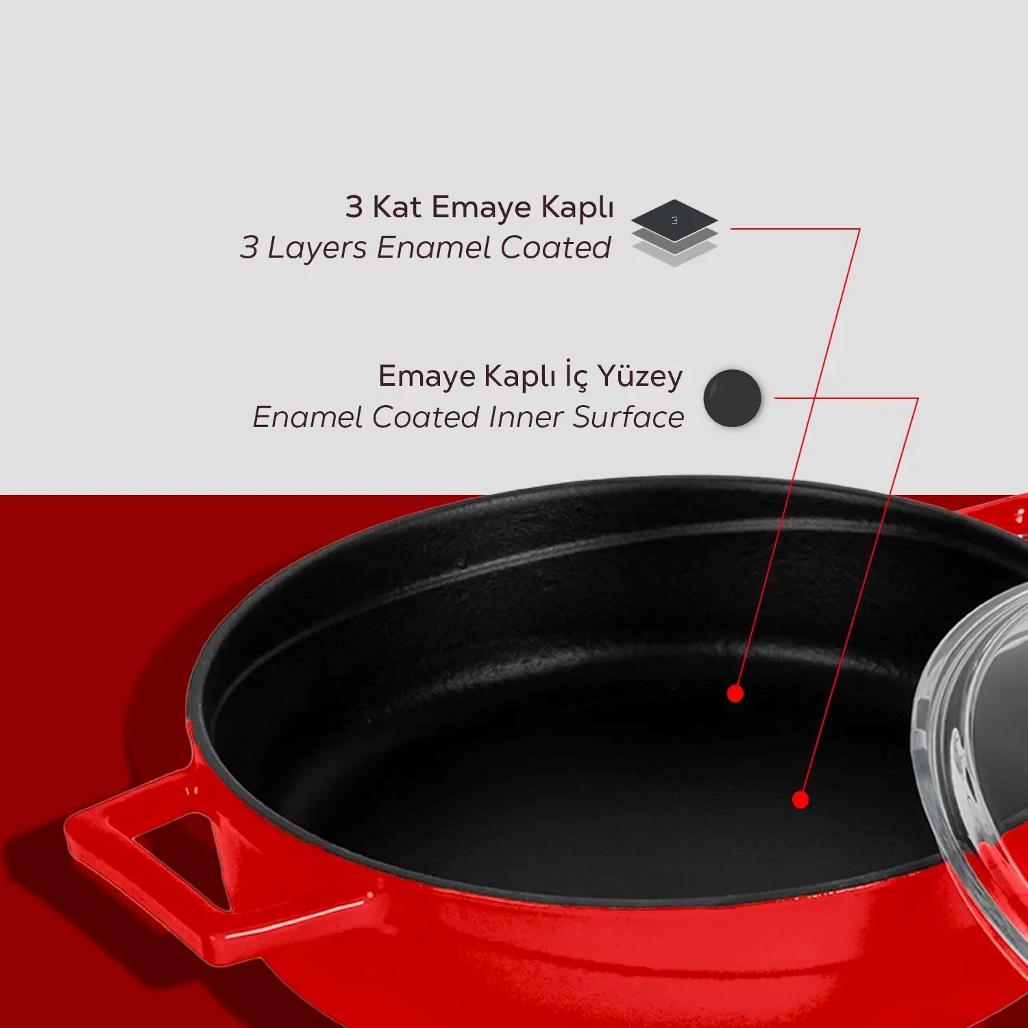 Der Glasemaille, das Material, das für die äußere Veredelung des Lava-Gusseisen-Kochgeschirrs verwendet wird, wird durch Sprühen von Glaspulver bei Temperaturen von 750 - 850 ° C erhalten. Das Glaspulver haftet an der Oberfläche des Kochgeschirrs und bildet eine Schutzschicht, die auch hilft, die Wärme optimal zu verteilen.