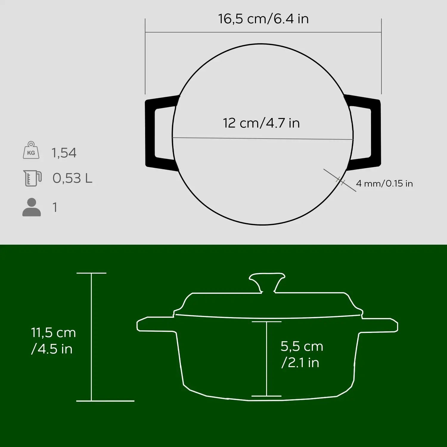 Die Wandstärke der Minitöpfe beträgt 4 mm. Auf der Innenseite ist das Produkt mit einer Schicht schwarzer Emaille beschichtet, die beim Kochen mit Fett die Bildung einer antihaftbeschichteten Oberfläche erleichtert.