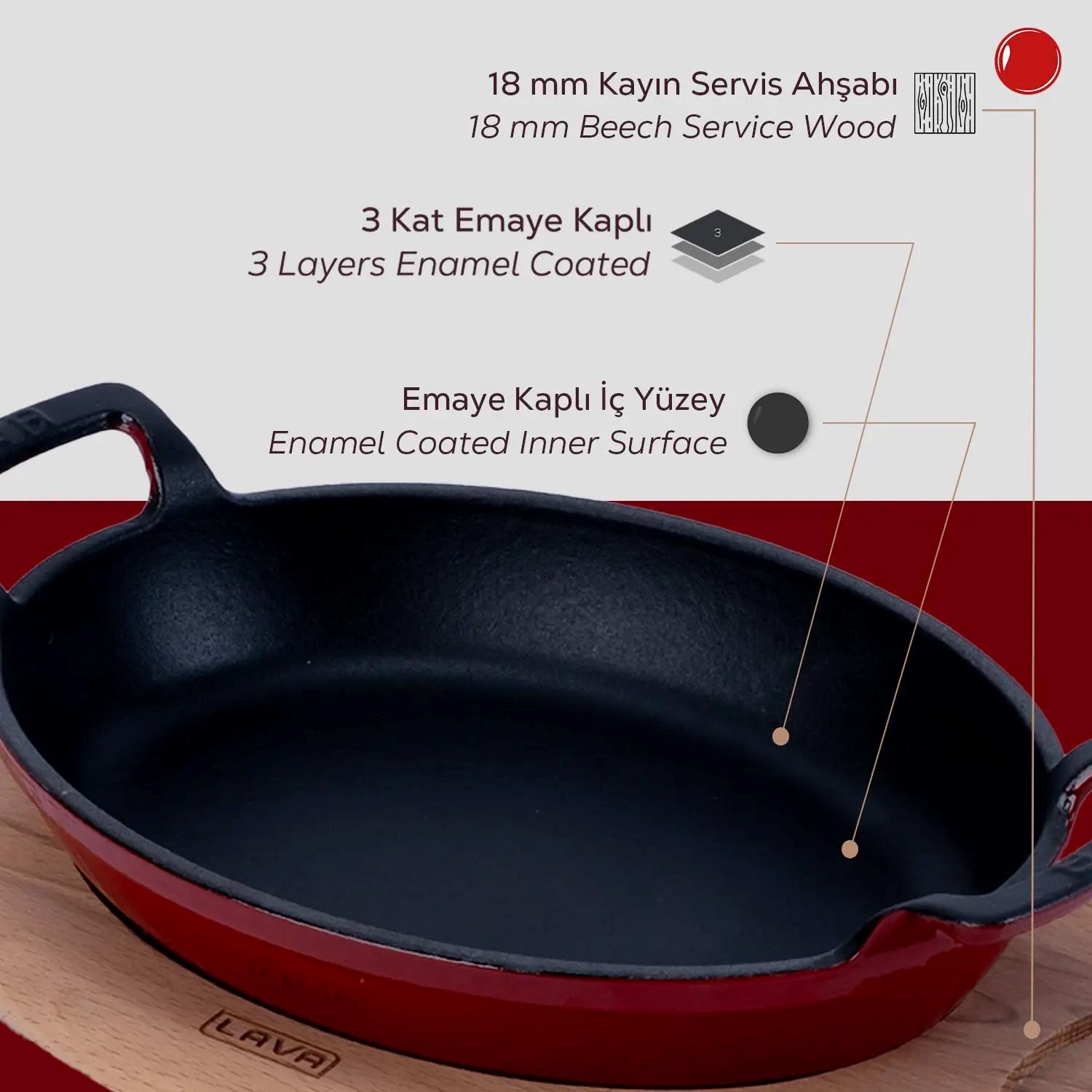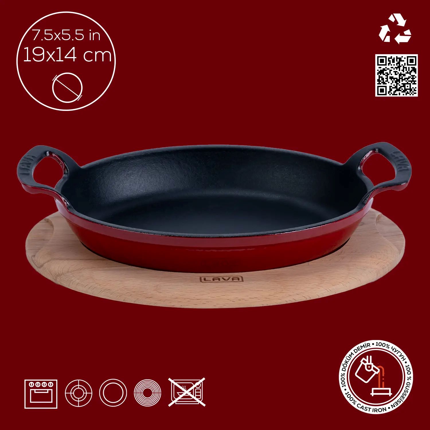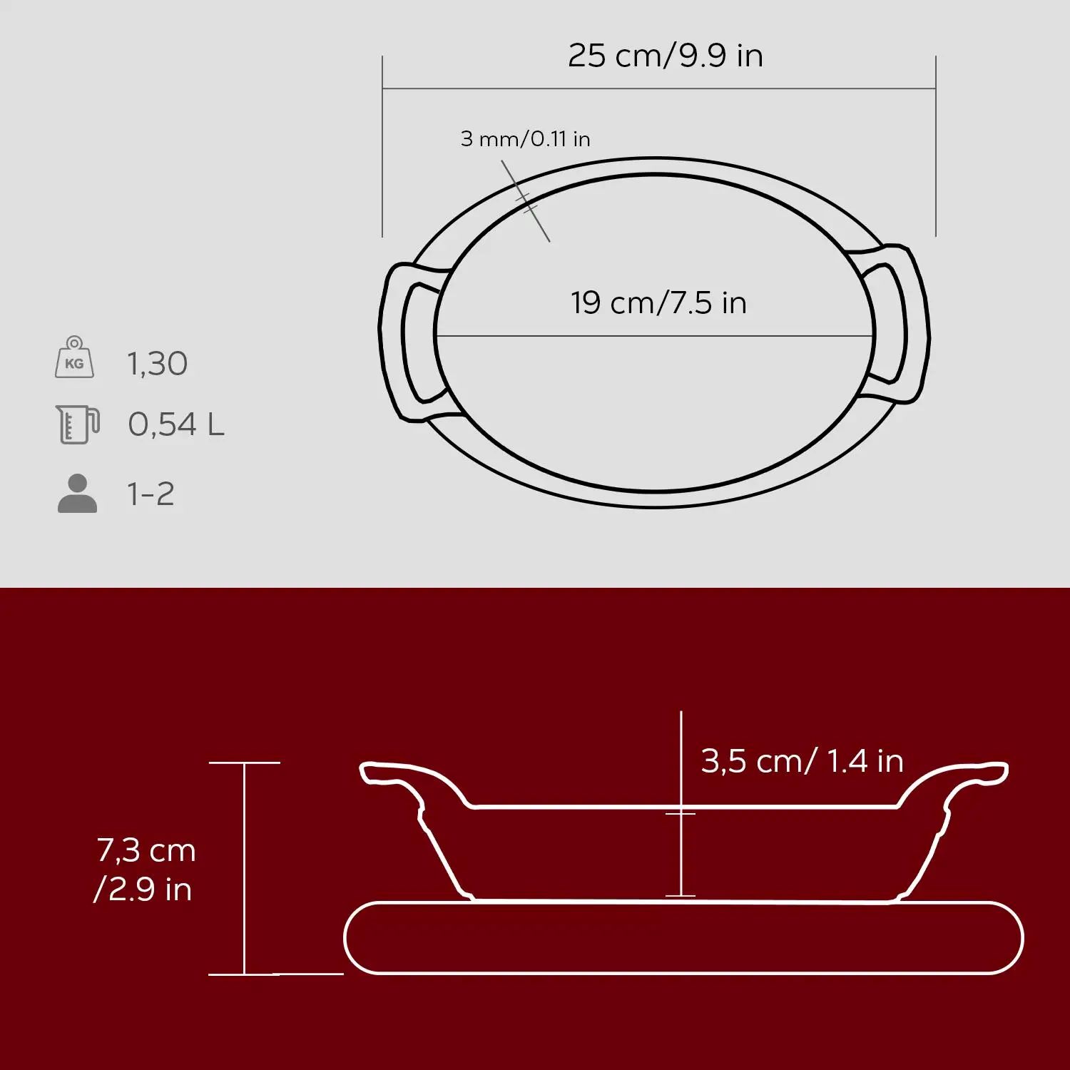 Die Bodenstärke beträgt 3,5 mm, wodurch Lava -Kochgeschirr auf allen Herdarten, einschließlich Induktionskochfeldern, verwendet werden kann. Nicht in der Mikrowelle verwenden.
