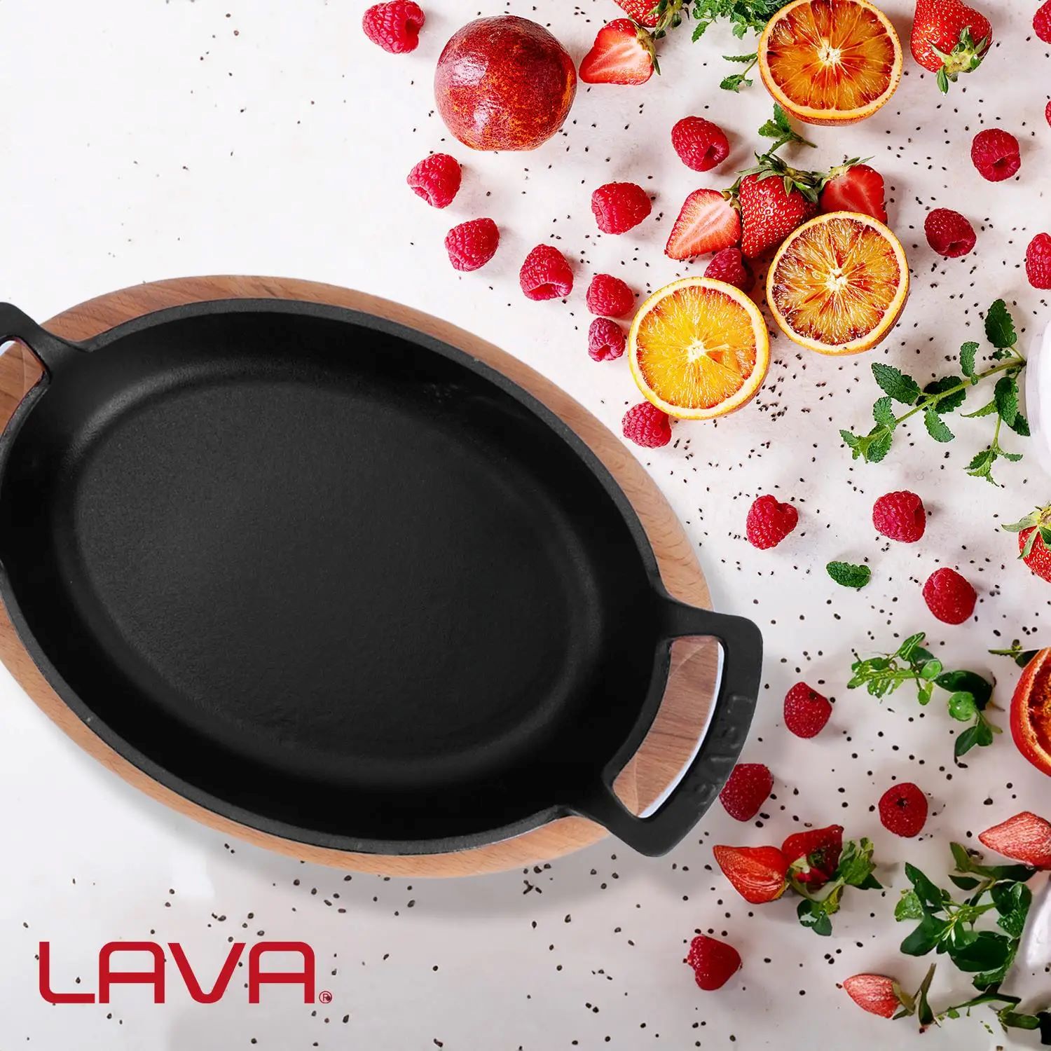 Ovale Schale mit Buchenholzständer, Schalenmaß (ohne Griffe) 19 x 14 cm, Fassungsvermögen 0,54 l, aus Gusseisen, Marke Lava