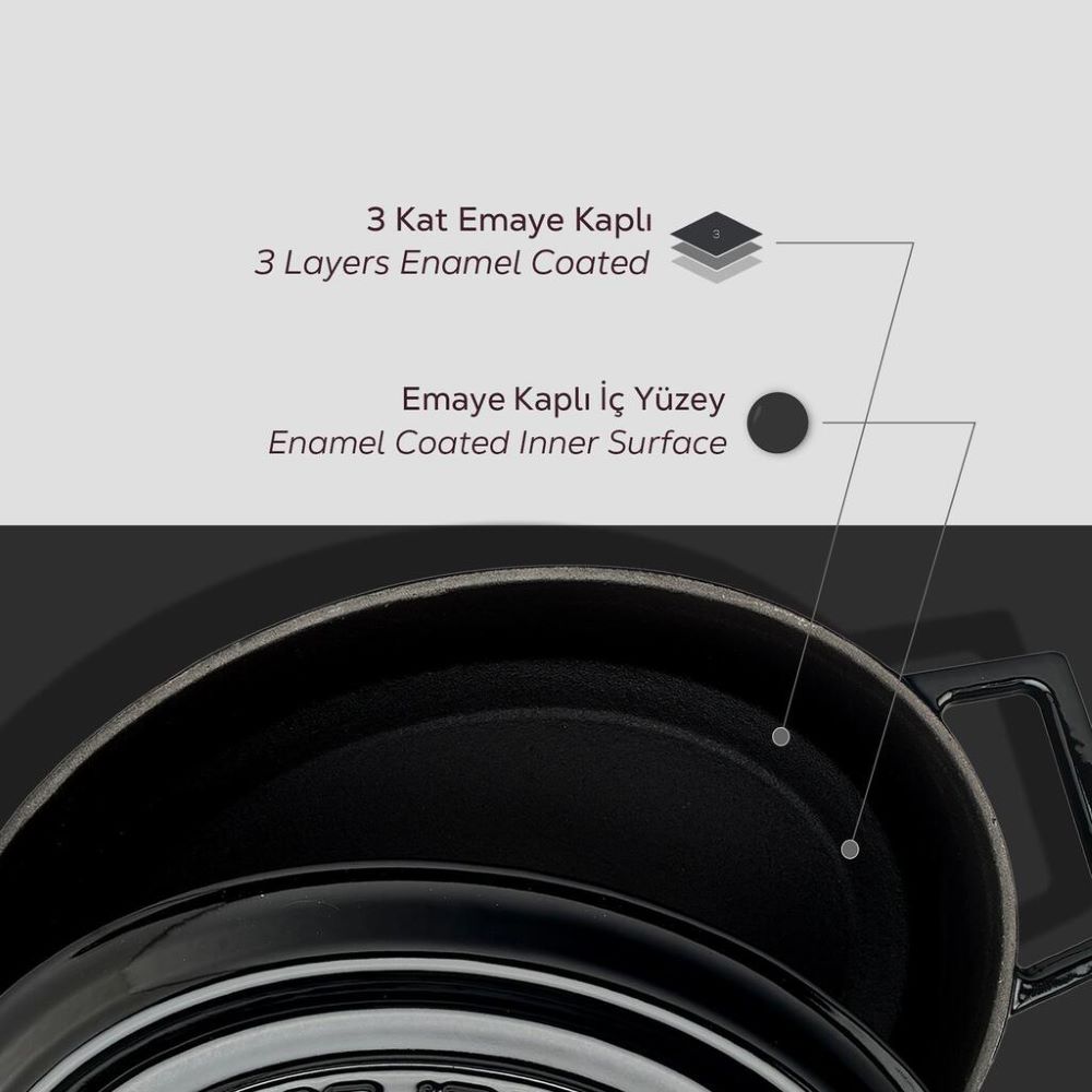 Die Topfwandstärke beträgt 4 mm. Auf der Innenseite ist das Produkt mit einer Schicht schwarzer Emaille beschichtet, die die Bildung einer Antihaft-Oberfläche beim Kochen mit Fett erleichtert.
