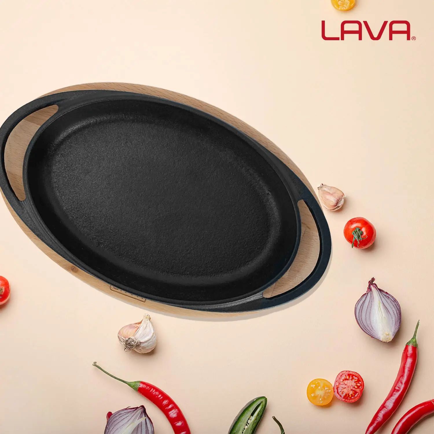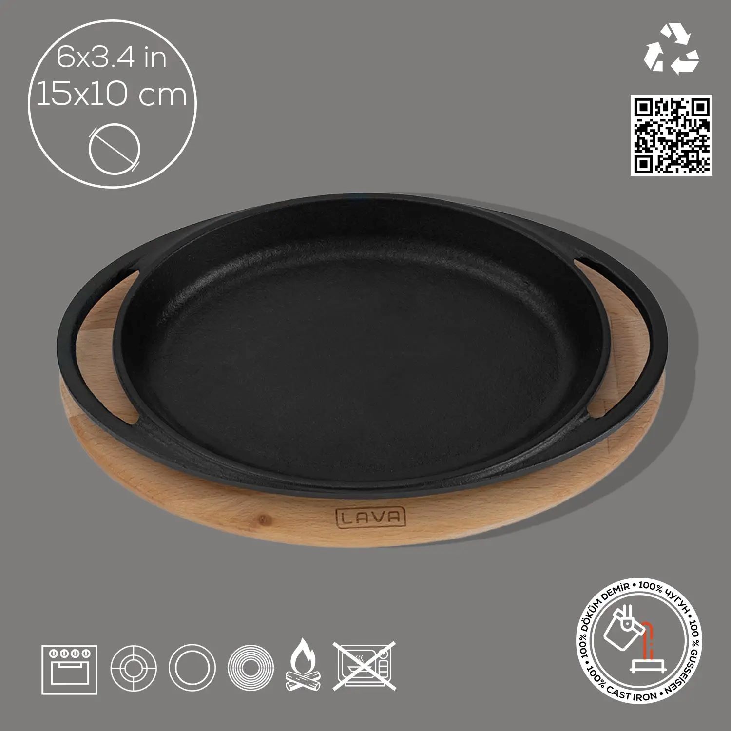 Ovales Tablett, hergestellt von Lava, aus Gusseisen mit Holzsockel.