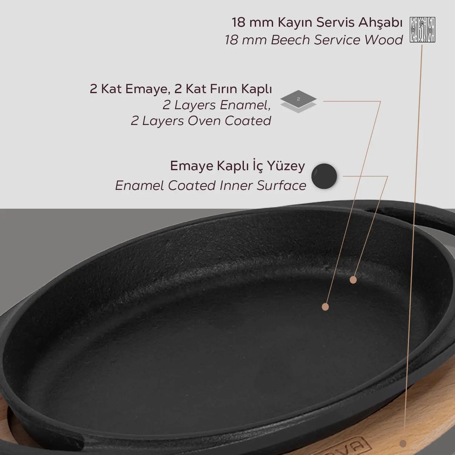 Die Schalenwände sind 4 mm dick, und das Innere ist mit einer schwarzen Emailleschicht versehen, die beim Kochen mit Fetten eine antihaftbeschichtete Oberfläche erzeugt.