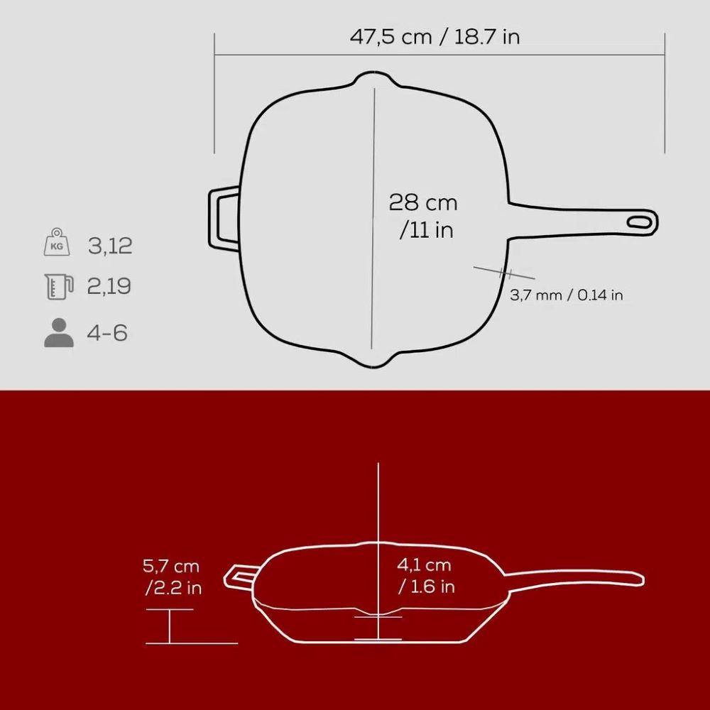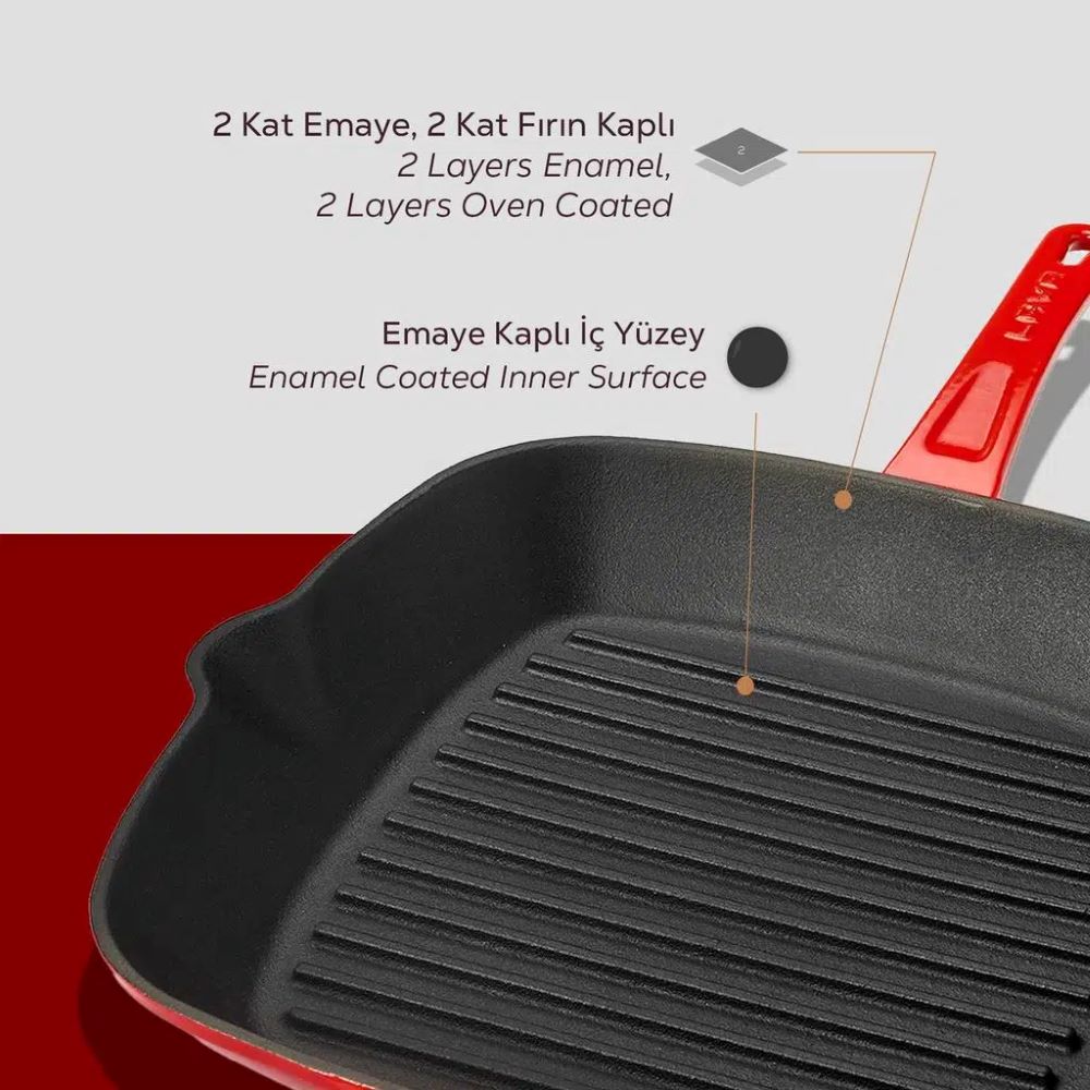 Die Wände der Grillpfanne sind 3,7 mm dick und auf der Innenseite ist dieses Produkt mit einer Schicht schwarzer Emaille beschichtet, die die Bildung einer Antihaftoberfläche beim Kochen mit Fett erleichtert.