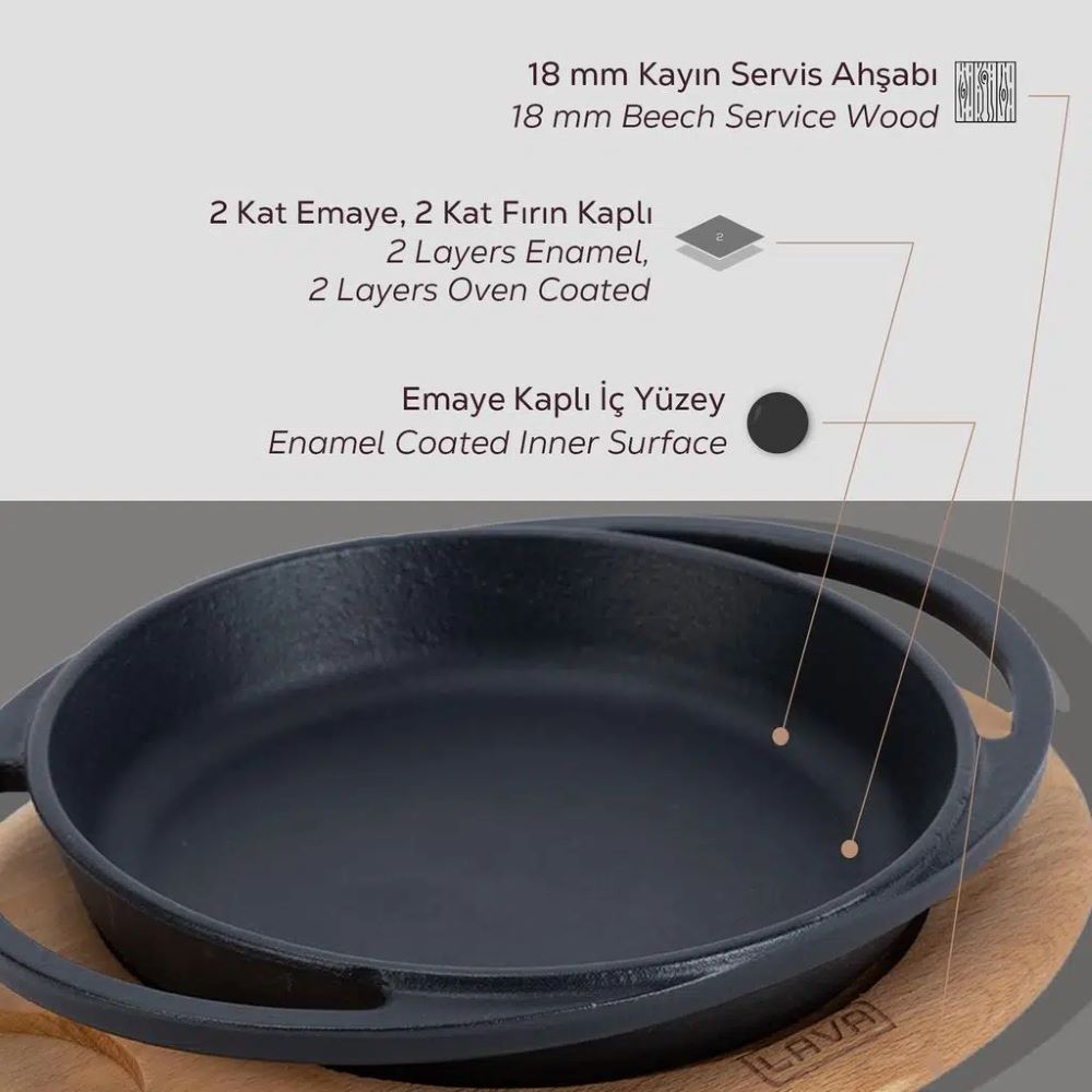 Die Wände der Schüssel sind 4 mm dick und auf der Innenseite ist die Schüssel mit einer Schicht schwarzen Emails überzogen, die die Bildung einer Antihaftoberfläche beim Kochen mit Fett erleichtert.