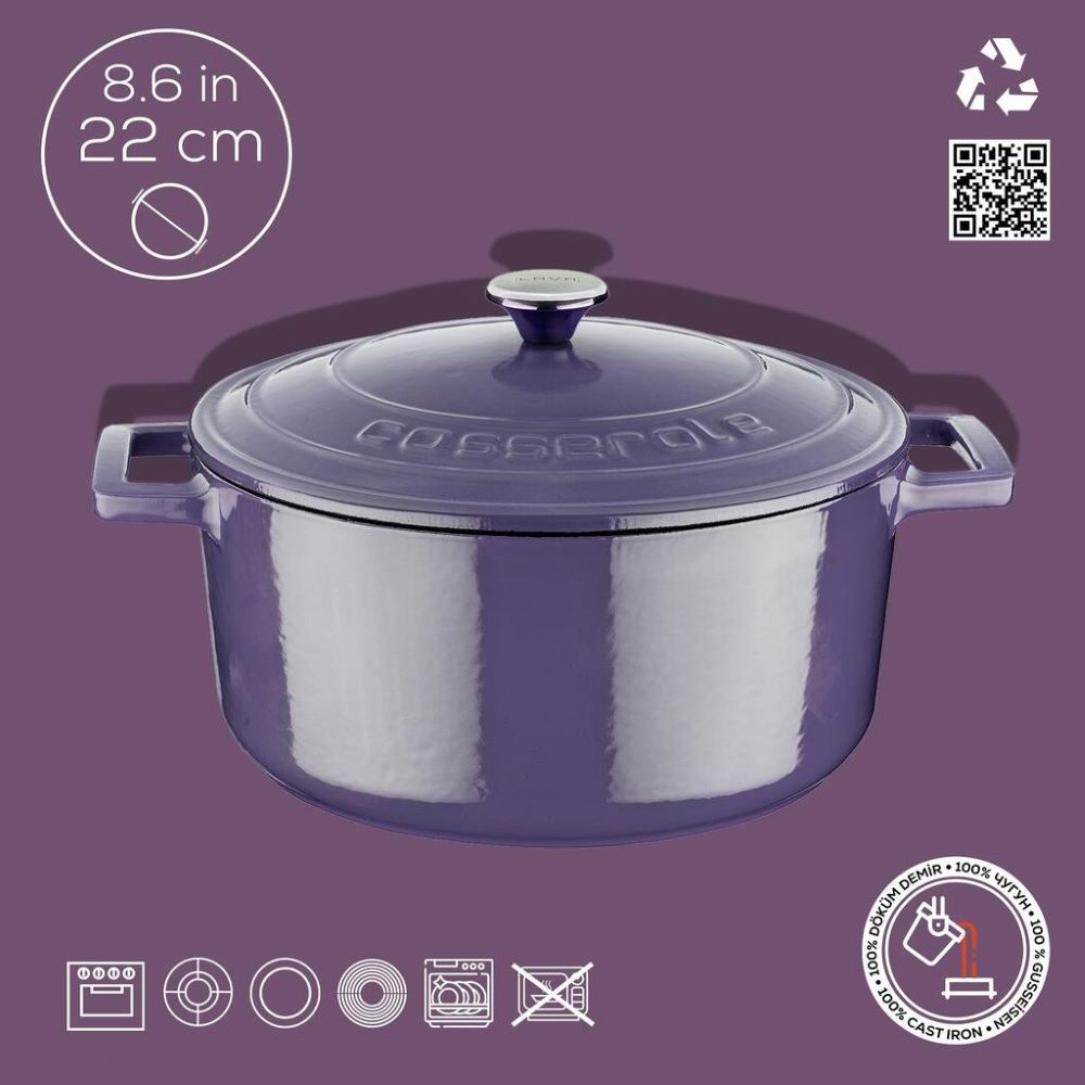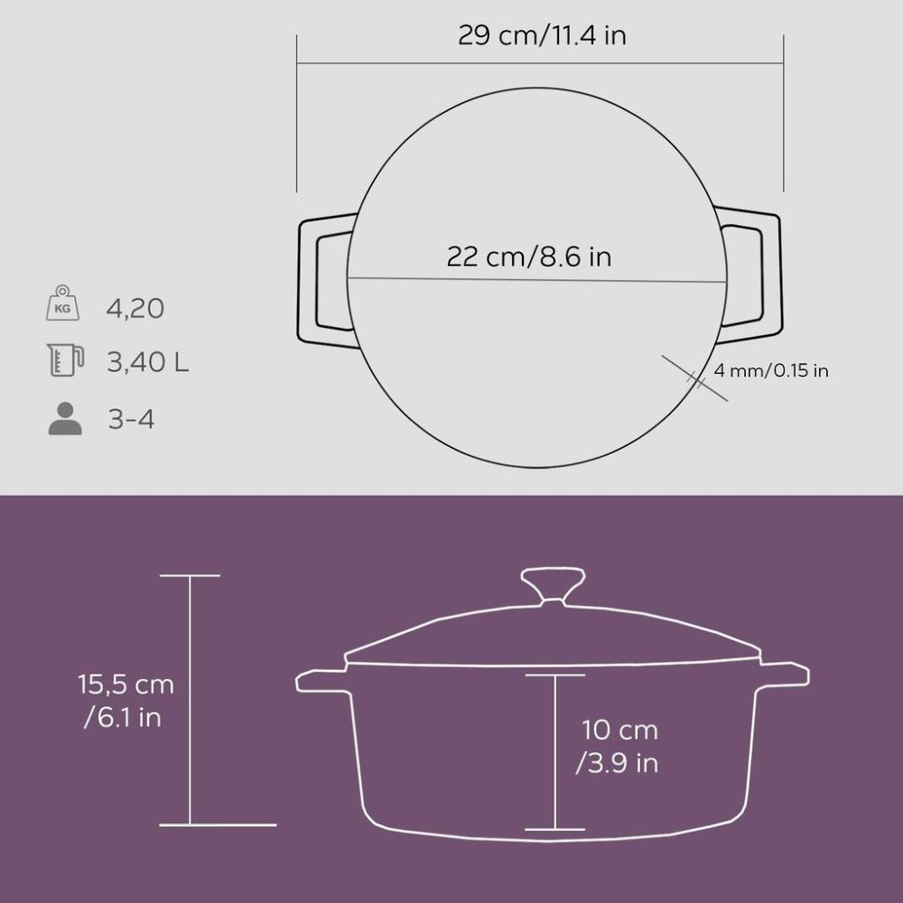 Gusseisen ist ein Material, das sich langsam erwärmt, aber nach dem Erhitzen die Wärme sehr gut über einen langen Zeitraum speichert. Somit ist das Kochgeschirr für die meisten Kochtechniken geeignet, sei es Braten, Schongaren oder Garen im Ofen.