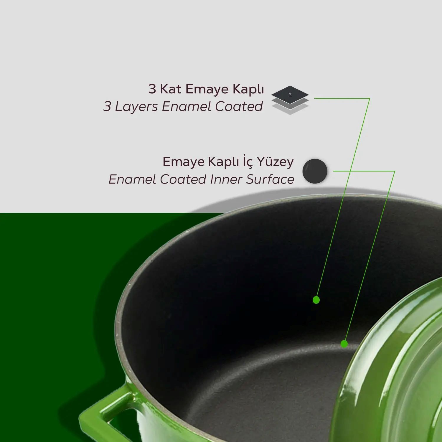 Die glasartige Emaille, das Material für die äußere Veredelung des Lava gusseisernen Kochgeschirrs, wird durch das Aufsprühen von Glaspulver bei Temperaturen von 750 - 850 °C gewonnen. Das Glaspulver haftet an der Oberfläche des Topfes und bildet eine Schutzschicht, die auch dazu beiträgt, die Wärme optimal zu verteilen.