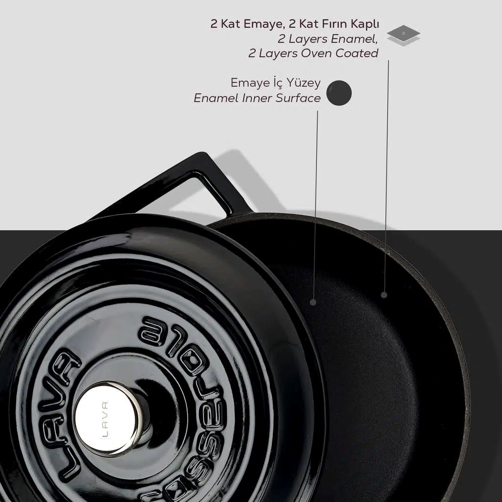 Die Glasemaille, Material, das für die äußere Veredelung des Lava-Gusseisen-Kochgeschirrs verwendet wird, wird durch Sprühen von Glaspulver bei Temperaturen von 750 - 850 ° Cerhalten.  Das Glaspulver haftet an der Oberfläche des Topfes und bildet eine Schutzschicht, die auch hilft, die Wärme optimal zu verteilen.