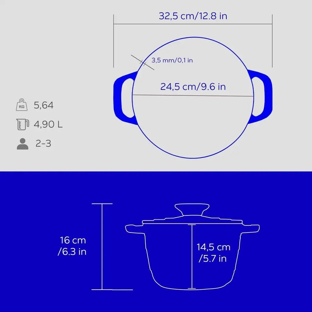 Der Topfboden ist 4,5 mm dick und die Wände sind 3,5 mm dick. Im Inneren des Topfes befindet sich eine Schicht aus schwarzer Emaille , die die Schaffung einer antihaftbeschichteten Oberfläche beim Kochen mit Fetten erleichtert.