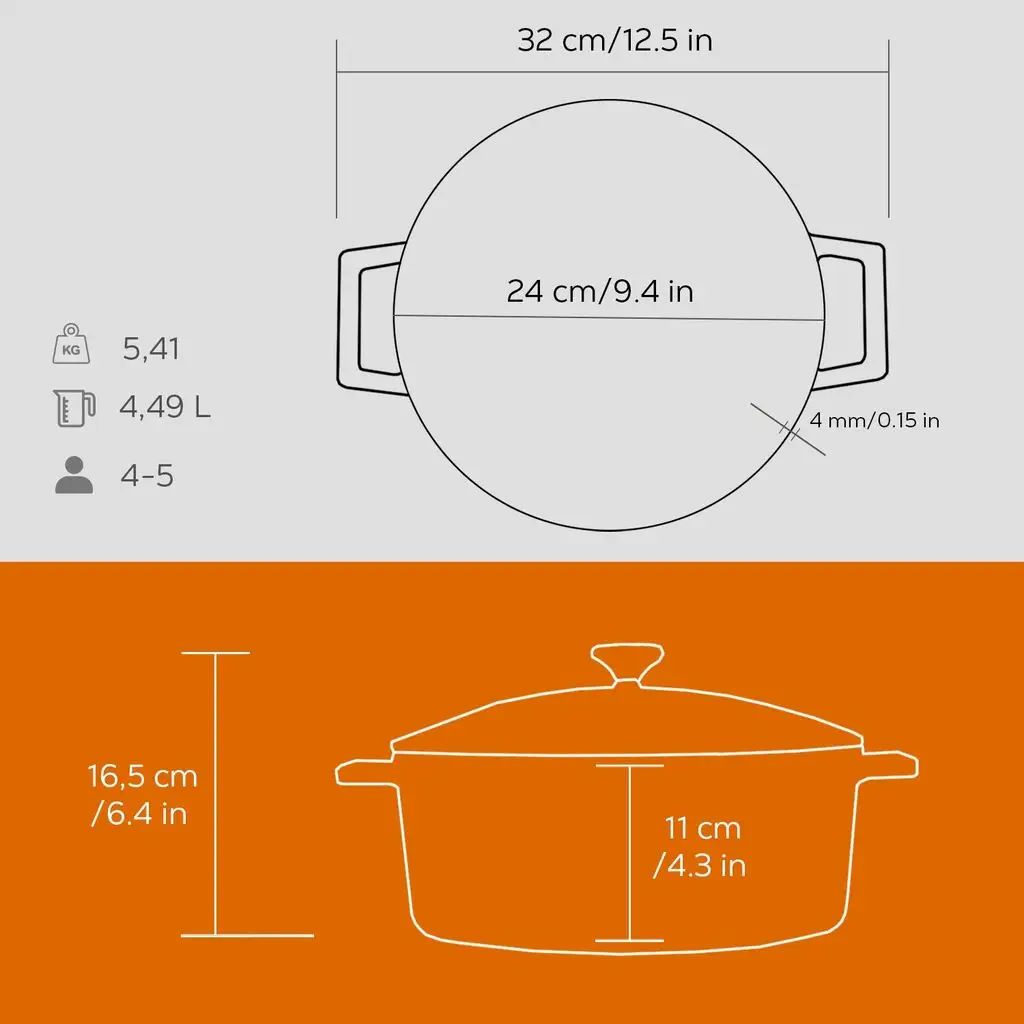 Gusseisen ist ein Material, das sich langsam erwärmt, aber nach dem Erhitzen die Wärme sehr gut über einen langen Zeitraum speichert. Somit ist das Kochgeschirr für die meisten Kochtechniken geeignet, sei es Braten, Schongaren oder Garen im Ofen.