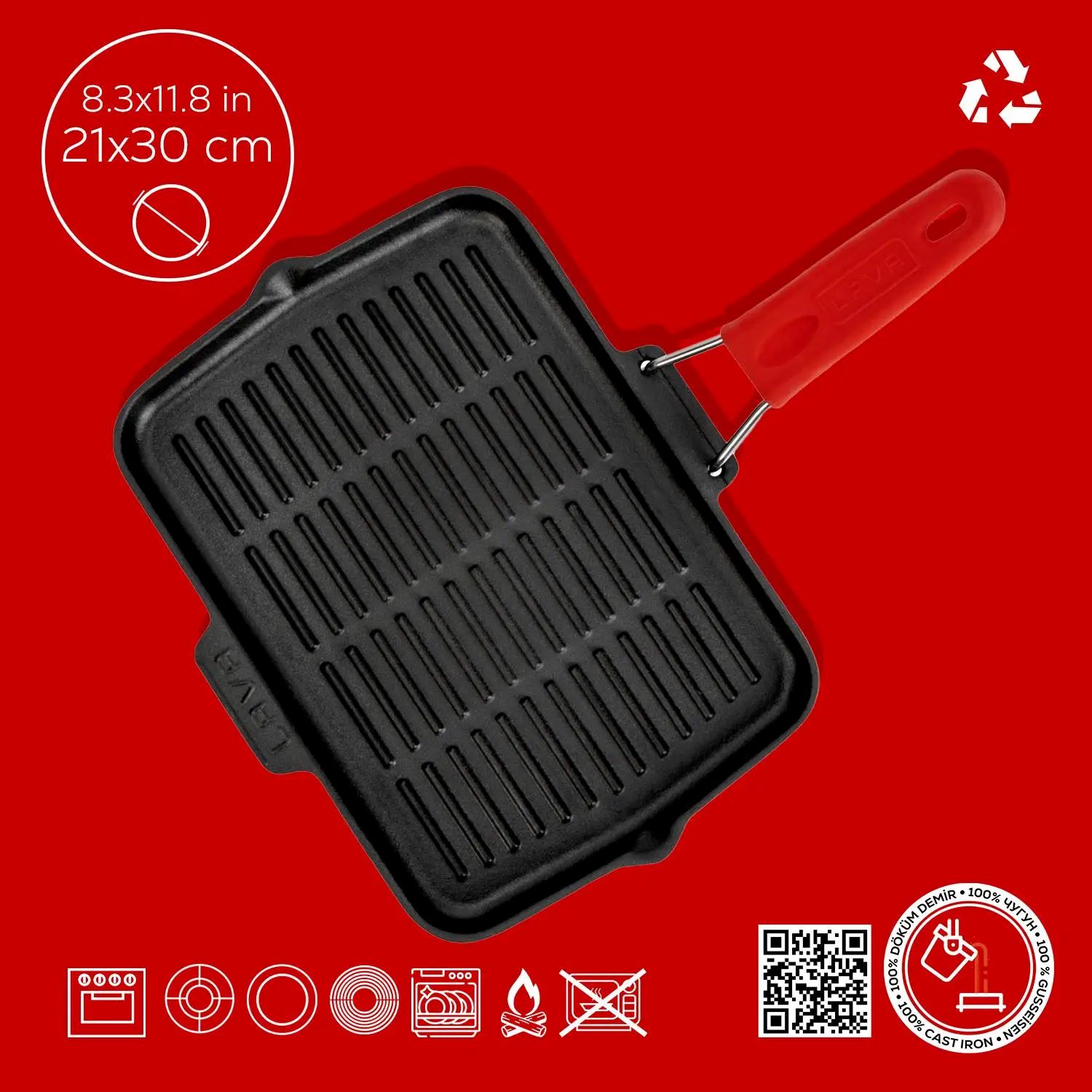 Grill pan, Lava brand, dimensions of 21 x 30 cm, made from cast iron.