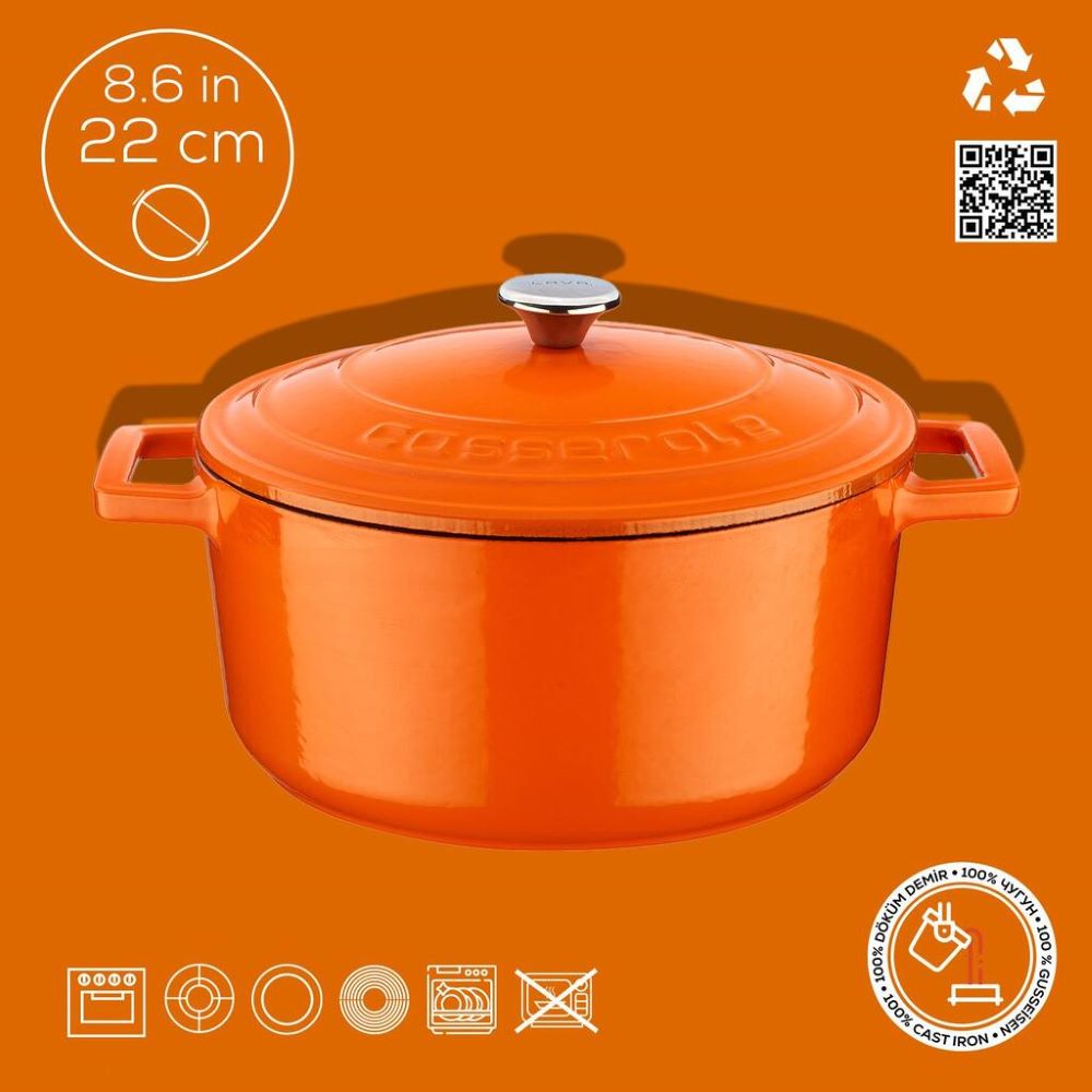 Cast iron is a material that heats up slowly but, once heated, it retains heat very well for a long time. Thus, the cookware are suitable for most cooking techniques, be it frying, slow cooking or oven cooking.