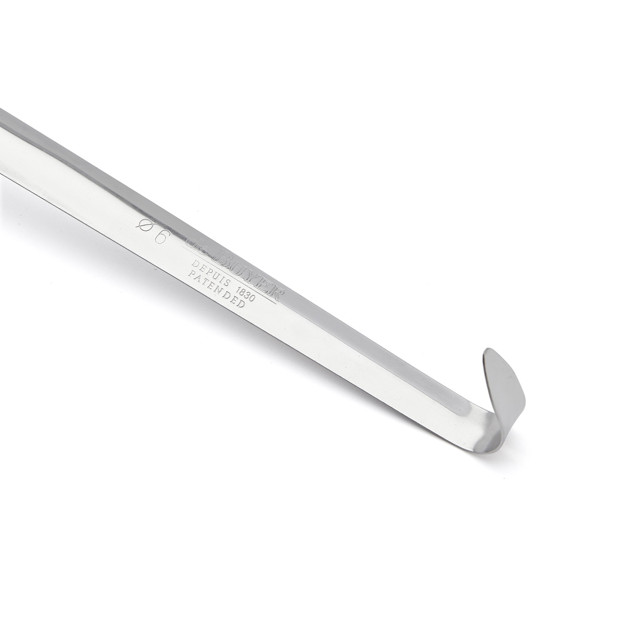 Louche, produite par de Buyer, 32,5 cm de longueur (longueur de manche de 28 cm), diamètre 6 cm, capacité 0,05 L et 1,2 mm d’épaisseur et fabriqué en acier inoxydable.
